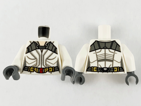 Torso Female Jumpsuit, Light Nougat Neck, Dark Bluish Gray Shoulder Panel and Design Lines Pattern / White Arms / Dark Bluish Gray Hands
