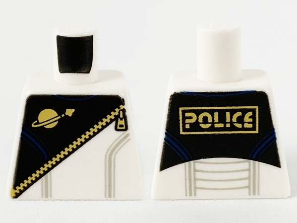 Torso Spacesuit with Black Panel, Gold Zipper and Classic Space Logo, Light Bluish Gray Lines, 'POLICE' on Back Pattern