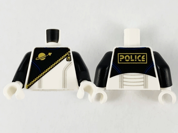 Torso Spacesuit with Black Panel, Gold Zipper and Classic Space Logo, Light Bluish Gray Lines, 'POLICE' on Back Pattern / Black Arms / White Hands