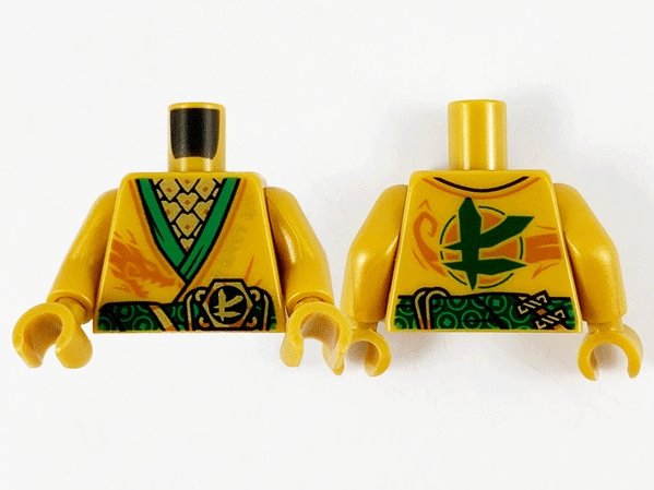 Torso Tunic with Green Hems and Sash, Gold Scale Armor, Dark Orange Dragon and Gold Ninjago Logogram Letter L Pattern / Pearl Gold Arms / Pearl Gold Hands