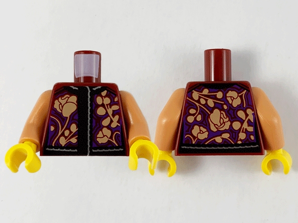 Torso Vest, Silver and Black Trim, Tan Roses, Leaves and Dark Purple Outlines Pattern / Nougat Arms / Yellow Hands