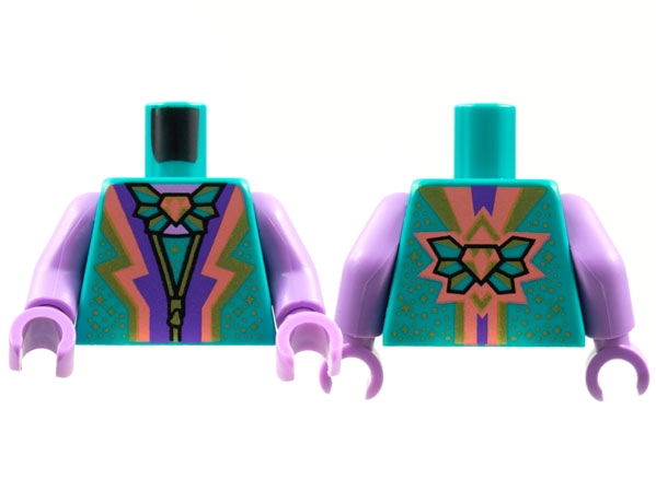 Torso Jewel Brooch, Gold Zipper and Sparkles, Coral and Dark Purple Lightning Stripes Pattern / Medium Lavender Arms / Medium Lavender Hands