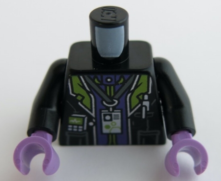 Torso Black Lab Coat with Dark Bluish Gray Pockets and Silver Trim with ID Card on Lanyard, Dark Purple and Lime Undershirt Pattern / Black Arms / Medium Lavender Hands