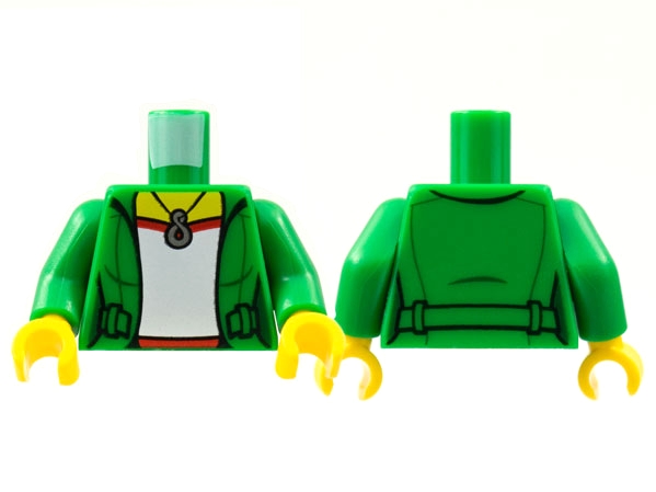Torso Female Jacket Open over Red and White Shirt without Wrinkle, Silver Infinity Pendant Necklace, Yellow Neck Pattern / Green Arms / Yellow Hands