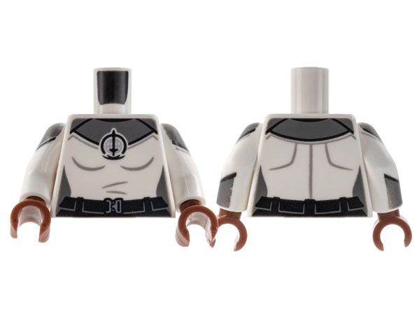 Torso Female, Dark Bluish Gray Shoulders, SWORD Logo Pattern / White Arms with Dark Bluish Gray Shoulder and Cuff Pattern / Reddish Brown Hands