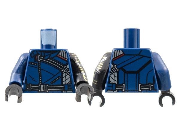 Torso Jacket Black Strap, Zippers, and Belt Pattern / Black Arm Left with Gold and Silver Circuitry Pattern / Dark Blue Arm Right / Black Hands
