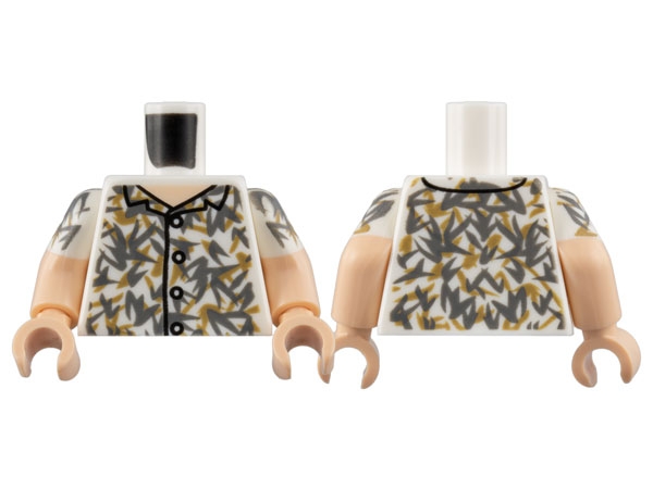 Torso Shirt, Light Nougat Neck, Buttons, Dark Bluish Gray and Tark Tan Floral Pattern / Light Nougat Arms with White Short Sleeves, Floral Pattern / Light Nougat Hands