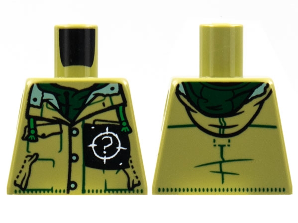 Torso Button Up Shirt with Hood, Open Collar, Dark Green Trim, White '?' on Black Pocket Patch Pattern