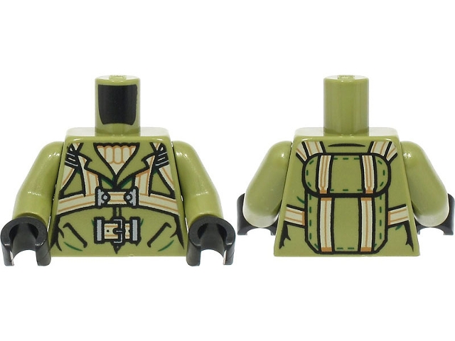 Torso Jacket over Tan Sweater, Harness and Belt with Buckle, Parachute Pack on Back Pattern / Olive Green Arms / Black Hands