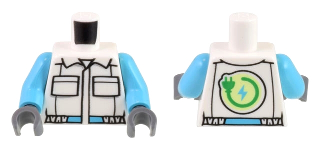Torso Jumpsuit with 2 Pockets, Collar, Black and Medium Azure Belt, Bright Green Electric Power Plug Symbol Pattern / Medium Azure Arms / Dark Bluish Gray Hands