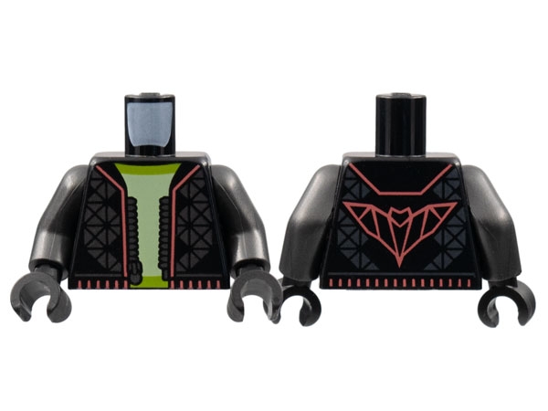 Torso Jacket with Pearl Dark Gray Tiling and Zipper, Coral Trim and Bat on Back, Yellowish Green Shirt Pattern / Pearl Dark Gray Arms / Black Hands