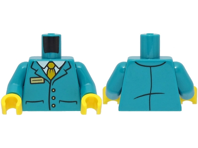 Torso Suit Jacket with 3 Buttons and Pockets over White Shirt, Bright Light Orange Tie, Gold Badge Pattern / Dark Turquoise Arms / Yellow Hands
