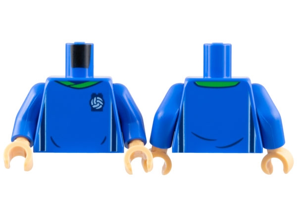 Torso Soccer Uniform, Bright Green Collar, White and Dark Blue Side Stripes, Soccer Ball on Brick Logo Pattern / Blue Arms / Medium Tan Hands