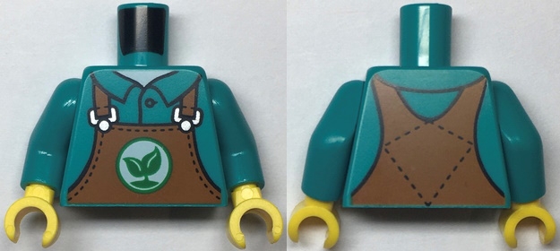 Torso Dark Orange Overalls with Green Sprout with 2 Leaves on White Circle Pattern / Dark Turquoise Arms / Yellow Hands