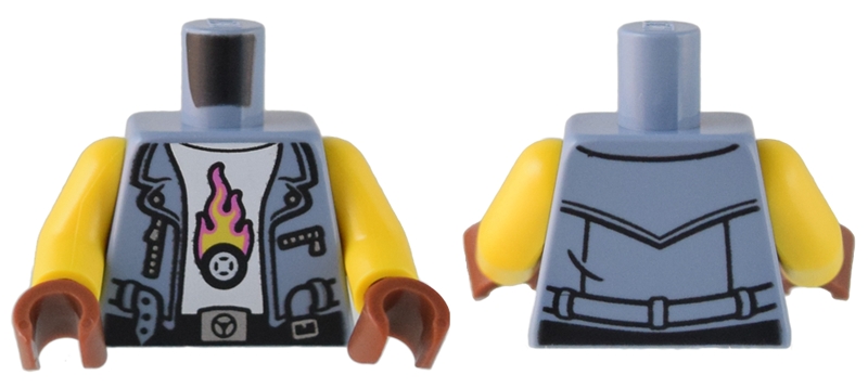 Torso Vest with Belt and Silver Zippers over White Shirt with Tire with Flames Pattern / Yellow Arms / Reddish Brown Hands