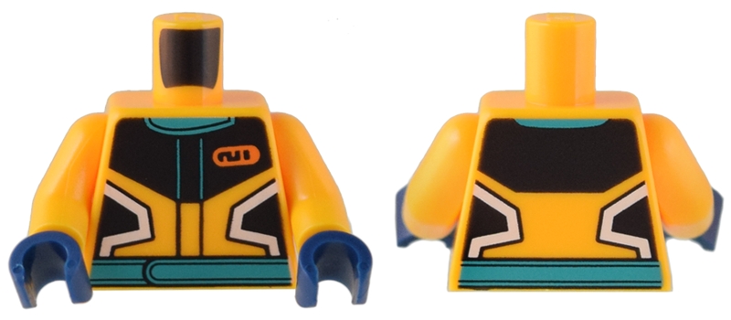 Torso Racing Jacket Black and White Panels, Dark Turquoise Collar and Belt, and Orange Name Tag Pattern / Bright Light Orange Arms / Dark Blue Hands