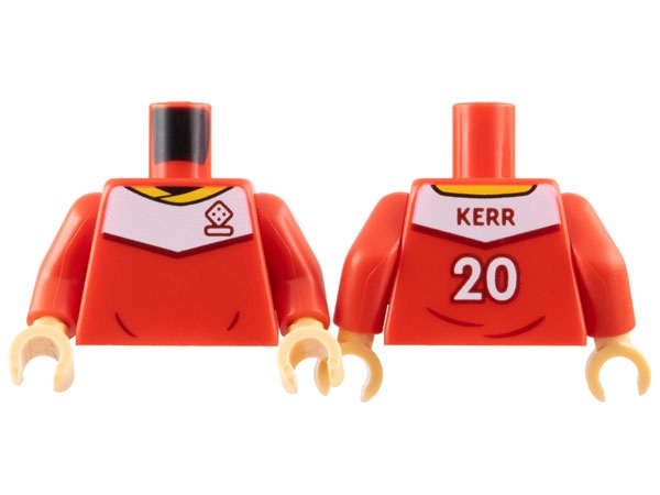 Torso Soccer Uniform, Yellow Collar, White Shoulder Panel, Dark Red Dice Logo, 'KERR 20' on Back Pattern / Red Arms / Medium Tan Hands