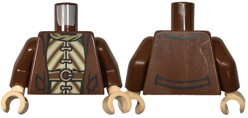 Torso Coat Open over Tan Dress with Copper Clasps and Dark Tan and Reddish Brown Diagonal Stripes, Belt with Buckle, Scarf Pattern / Reddish Brown Arms / Light Nougat Hands