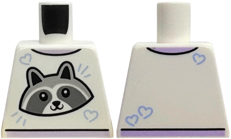 Torso T-Shirt with Light Bluish Gray and Dark Bluish Gray Raccoon Head, Bright Light Blue Hearts, Lavender Neck and Hem Pattern