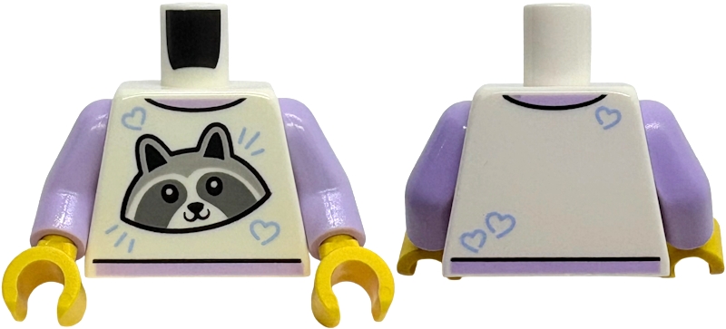 Torso T-Shirt with Light Bluish Gray and Dark Bluish Gray Raccoon Head, Bright Light Blue Hearts, Lavender Neck and Hem Pattern / Lavender Arms / Yellow Hands