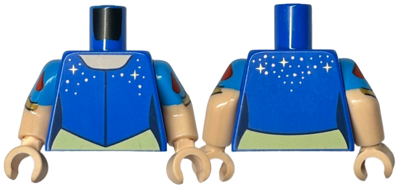 Torso Dress with Gold Sparkles and Dots and Bright Light Yellow Skirt, Light Nougat Neck Pattern / Light Nougat Arms with Molded Dark Azure Short Sleeves and Printed Red Drops and Gold Straps Pattern / Light Nougat Hands
