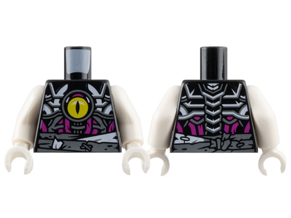 Torso White and Dark Bluish Gray Skeleton and Waist Wrappings, Yellow Eye with Slit Pupil, Magenta Tubes Pattern / White Arms / White Hands
