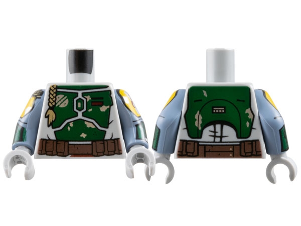 Torso SW Mandalorian Dark Green Armor, Belt, Braid, Silver Emblem and Battle Damage, Dark Red Rectangle Pattern / Sand Blue Arms with Armor Pattern / Light Bluish Gray Hands