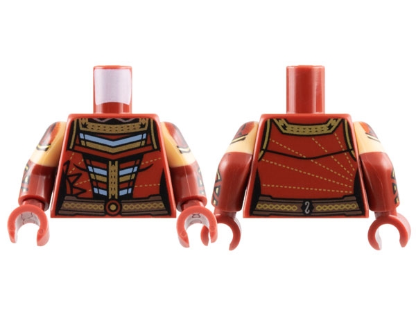 Torso Female Shirt with Center Panel with Gold and Sand Blue Stripes, Dark Brown Belt with Circle Buckle, Black Shoulders and Neck Pattern / Dark Red Arms with Molded Medium Tan Short Sleeves and Printed Dark Red Shoulders, Gold Trim and Straps on Gauntlets Pattern / Dark Red Hands