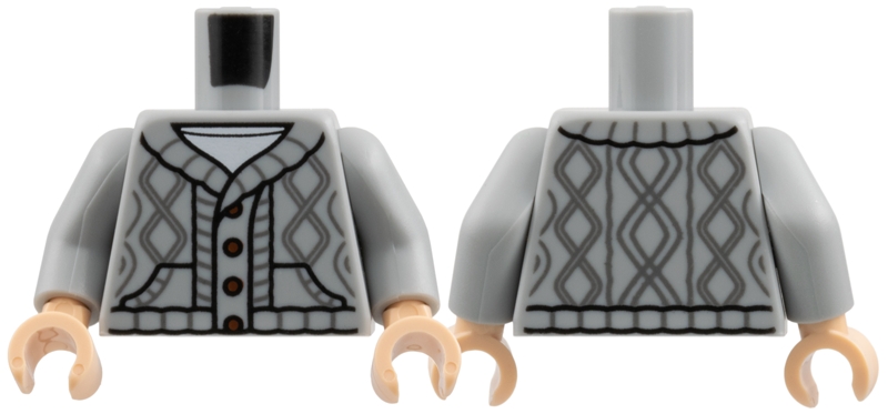 Torso Knit Cable Cardigan Sweater with Dark Bluish Gray Lines, Dark Brown Buttons, and Pockets over White Shirt Pattern / Light Bluish Gray Arms / Light Nougat Hands