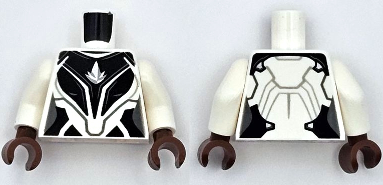 Torso Female Super Hero Costume with Black Armor Panels, Dark Bluish Gray Lines, Silver Logo on Chest Pattern / White Arms / Reddish Brown Hands