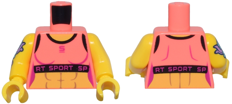 Torso Female Crop Top, Black Trim, Magenta 'SPORT' over Yellow Bare Skin with Muscles Pattern / Yellow Arm Left / Yellow Arm Right with Flower Tattoo Pattern / Yellow Hands