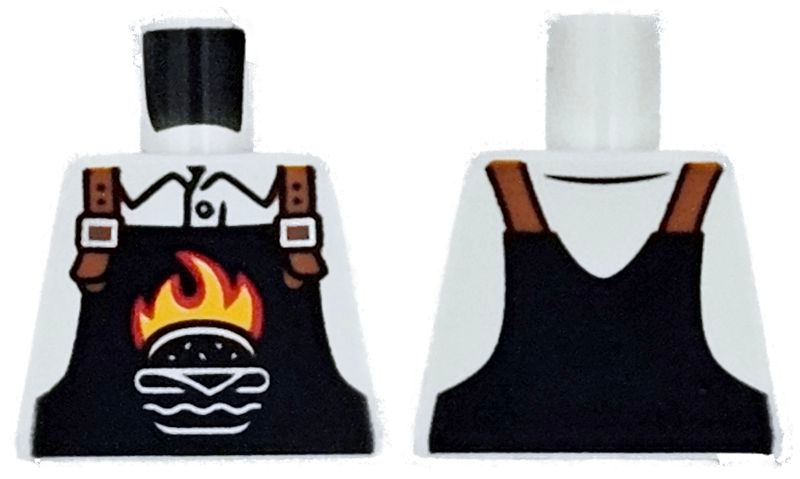 Torso Black Overalls with Burger Outline, Red and Bright Light Orange Flames and Dark Orange Straps over Shirt Pattern