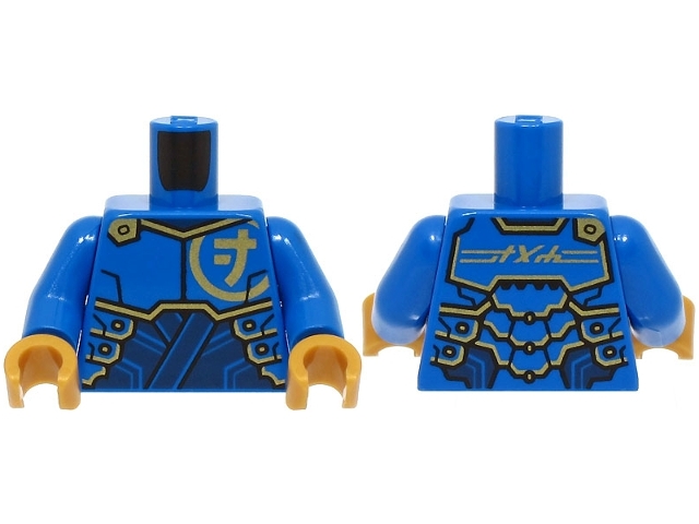 Torso Armor Plates over Dark Blue Tunic, Gold Trim and Ninjago Logogram Letter J, 'JAY' on Back Pattern / Blue Arms / Pearl Gold Hands