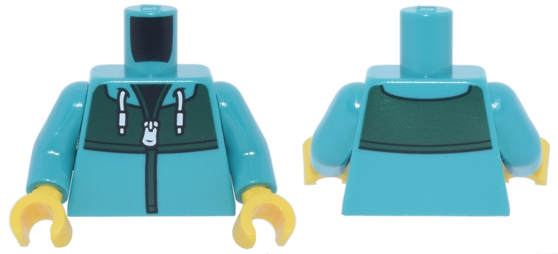 Torso Jacket with White Zipper, Drawstrings, Dark Green Panel and Trim over Black Shirt Pattern / Dark Turquoise Arms / Yellow Hands