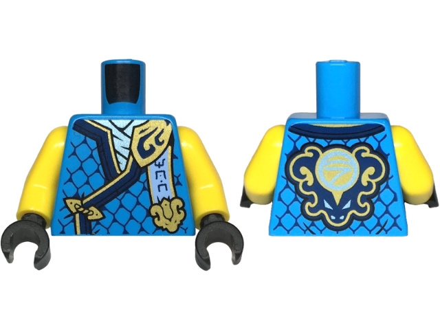 Torso Tunic with Dark Blue Hems, Gold Trim, Metallic Light Blue Shirt, Ninjago Logogram 'MOW', Letter N on Back Pattern / Yellow Arms / Black Hands