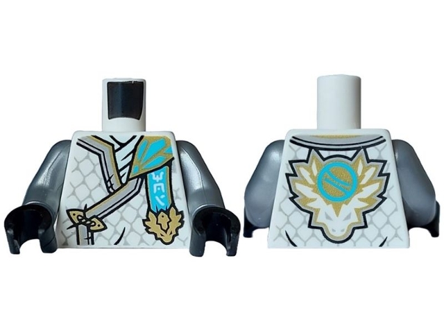 Torso Tunic with Light Bluish Gray Hems, Gold Trim, Light Aqua Shirt, Ninjago Logogram 'MOI', Medium Azure Letter Z in Dragon Head on Back Pattern / Flat Silver Arms / Black Hands