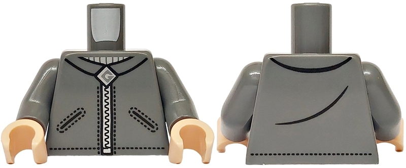 Torso Jacket with Black Pockets, Creases and Stitching, Light Bluish Gray Neck, Silver Zipper and Gru Logo Pattern / Dark Bluish Gray Arms / Light Nougat Hands