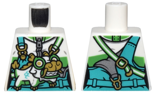 Torso Female Dark Turquoise Overalls and Belt over Jacket with Bright Green Stripe, Gold Buckles, Dragon Bag Pattern