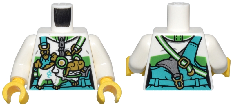 Torso Female Dark Turquoise Overalls and Belt over Jacket with Bright Green Stripe, Gold Buckles, Dragon Bag Pattern / White Arms / Yellow Hands