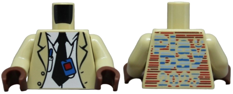 Torso Trench Coat over White Shirt, Black Tie, Decoder Badge and Pen, Play Day 2023 Logo and Lines on Back Pattern / Tan Arms / Reddish Brown Hands