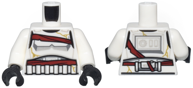 Torso SW Armor Stormtrooper, Simplified Armor with Shoulder Belts, Dark Red Bandages Around Chest and Stomach, Gold Cracks Pattern / White Arms / Black Hands
