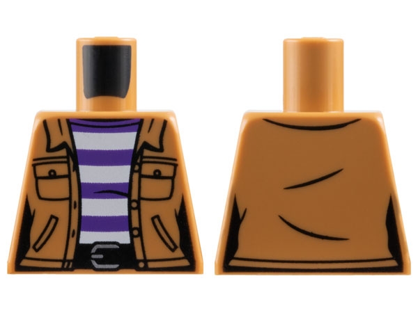 Torso Female Jacket with Pockets over White and Dark Purple Striped Shirt, Black Belt with Silver Buckle Pattern