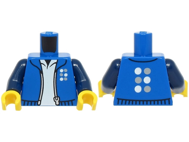 Torso Jacket Open with Silver Zipper and White and Light Bluish Gray Six Dots Logo over Shirt Pattern / Dark Blue Arms / Yellow Hands