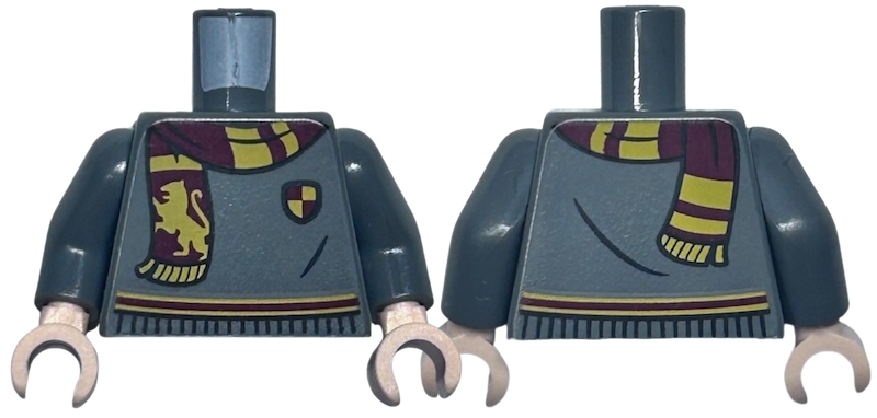 Torso Harry Potter Sweater, Dark Red and Bright Light Orange Gryffindor Stripe, Shield, and Scarf with Lion Pattern / Dark Bluish Gray Arms / Light Nougat Hands