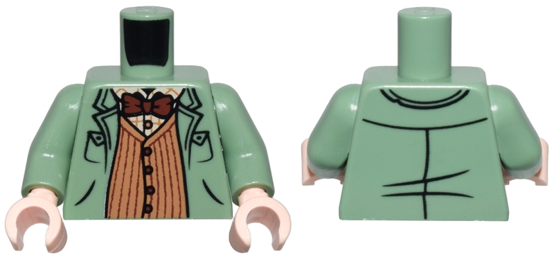 Torso Overcoat over Medium Nougat Striped Sweater Vest, Tan Plaid Shirt, and Reddish Brown Bow Tie Pattern / Sand Green Arms / Light Nougat Hands