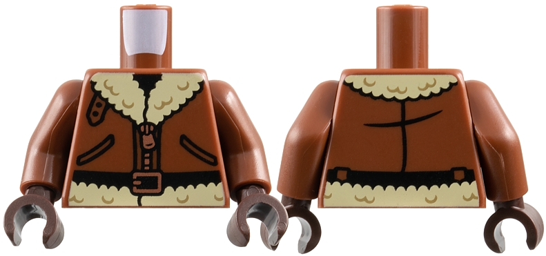 Torso Aviator Bomber Jacket with Pockets, Copper Zipper and Tan Fur Collar and Lining, Black Belt with Buckle Pattern / Reddish Brown Arms / Dark Brown Hands