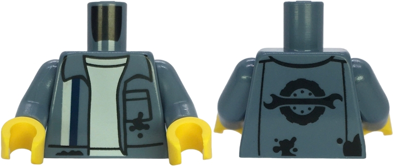 Torso Mechanic Uniform Open with White and Dark Blue Stripes, Black Oil Stains and Pocket over Shirt, Spanner Wrench and Wheel with Tire Logo on Back Pattern / Sand Blue Arms / Yellow Hands