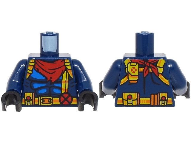 Torso Super Hero Costume with Blue Muscles, Harness and Belt with Pouches, Buckle and X-Men Logo, Red Neckerchief Pattern / Dark Blue Arms / Black Hands