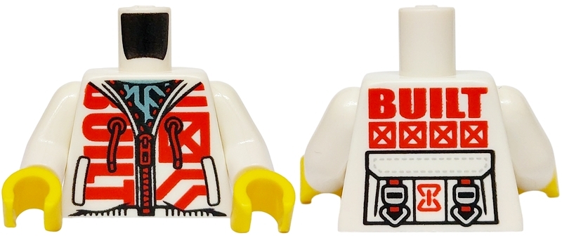 Torso Hoodie with Red Zipper, Drawstrings and 'BUILT', Metallic Light Blue Shirt, Harness Straps on Back Pattern / White Arms / Yellow Hands