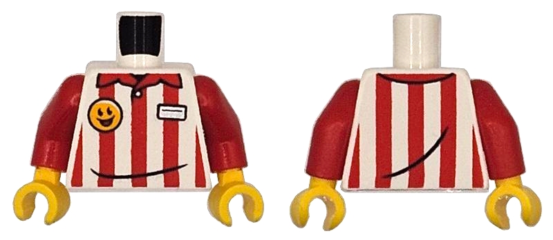 Torso Shirt with Button and Red Vertical Stripes and Collar, Silver Name Tag, Yellow Smiley Face Pin Pattern / Red Arms / Yellow Hands